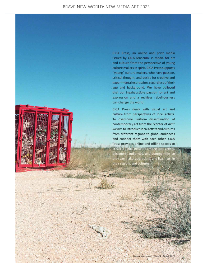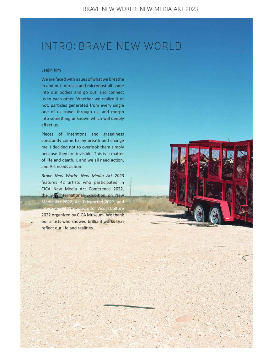 Brave New World: New Media Art 2023 features 42 artists who participated in CICA New Media Art Conference 2022, the 8th International Exhibition on New Media Art 2022, Art Teleported 2022, and International Symposium for Visual Culture 2022 organized by CICA Museum. We thank our artists who showed brilliant works that reflect our life and realities.