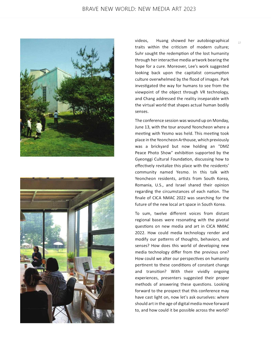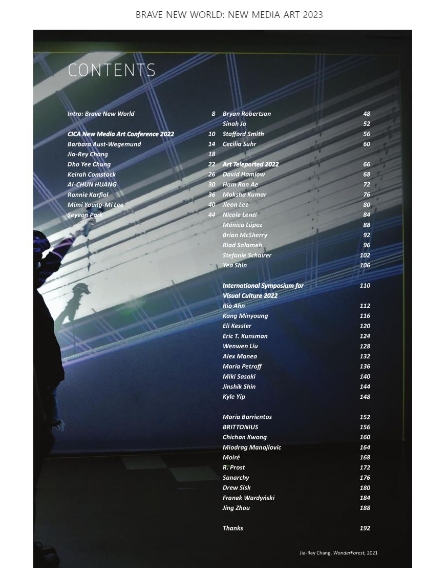 영문 서적 “Brave New World: New Media Art 2023 (멋진 신세계: 뉴 미디어 아트 2023)”은 2022 국제 뉴 미디어 아트 컨퍼런스, 제 8회 뉴 미디어 아트 국제전, 아트 텔레포티드 2022, 2022 시각문화 국제 심포지엄에 참여했던 42인의 아티스트들을 소개한다. 현대 사회 우리의 삶과 치열한 고민, 리얼리티를 담은 훌륭한 작품들을 보여주신 아티스트분들게 감사드린다.