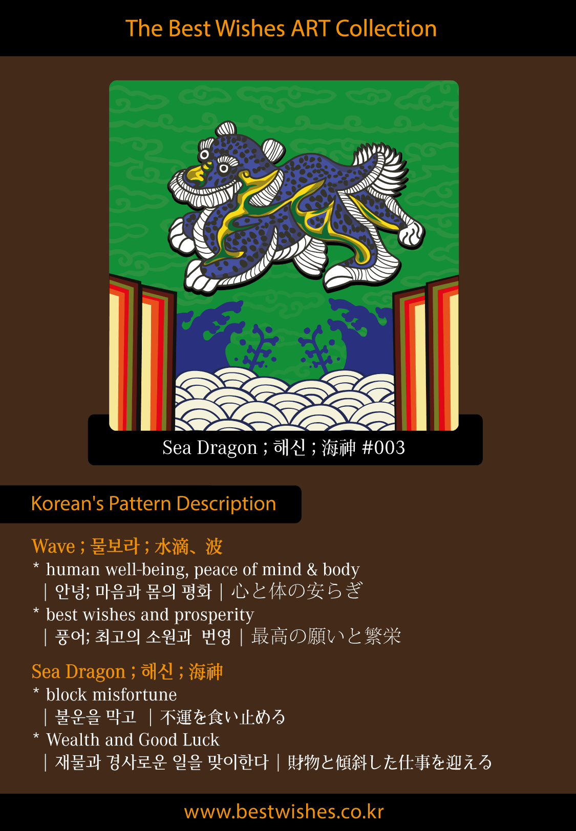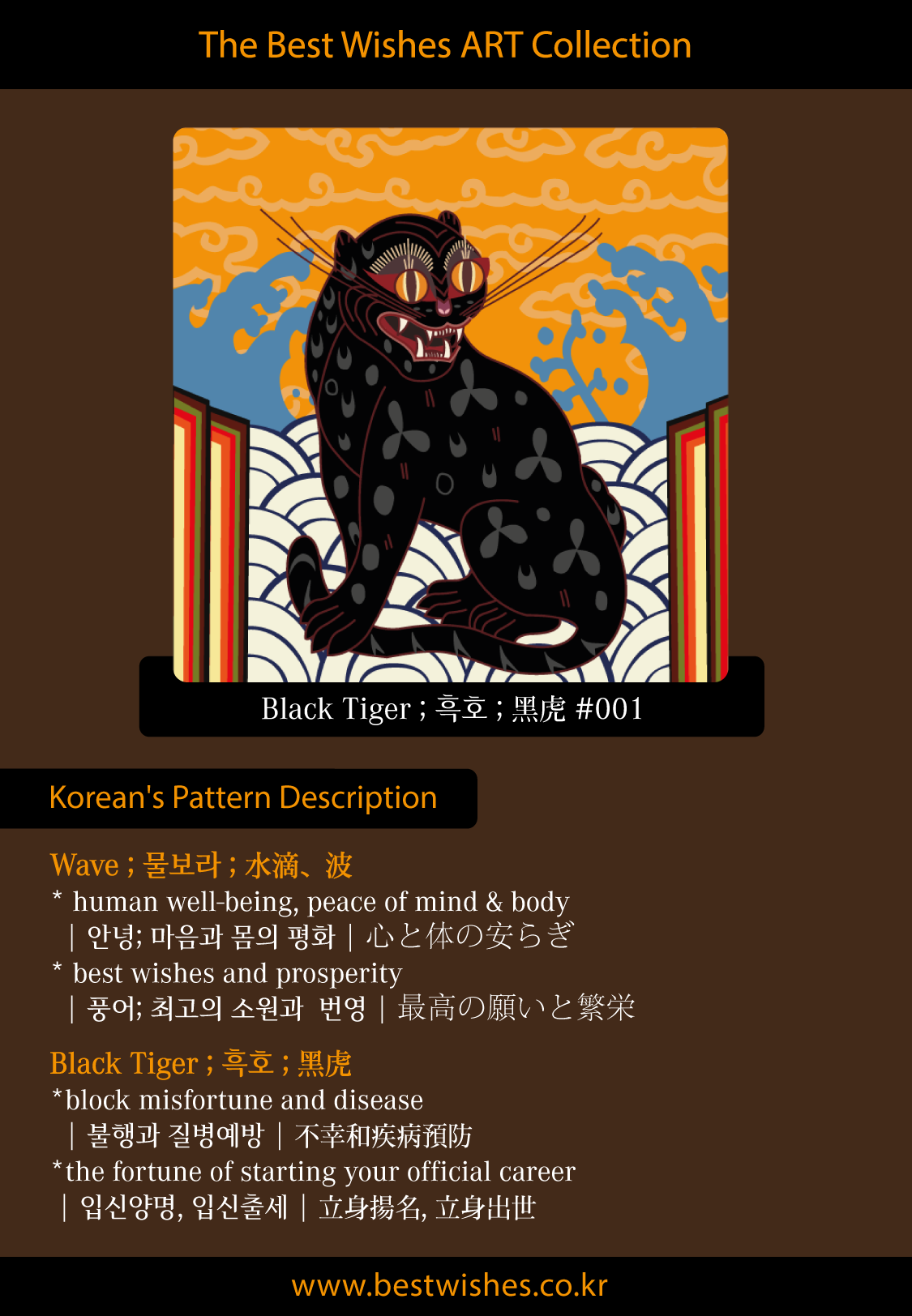 베스트위시즈는 한국문양의 현세적인 염원을 담은 커뮤니 케이션 소통의 수단으로 디지털 배경화면, 휴대폰 케이스, 애플와치 스트랩, 패션의류 및 스포츠, 게임 아이템까지 모두가 함께 즐길 수 있는 베스트위시즈만의 컨셉으로 생활에 밀접한 제품에 적용한 작품입니다.