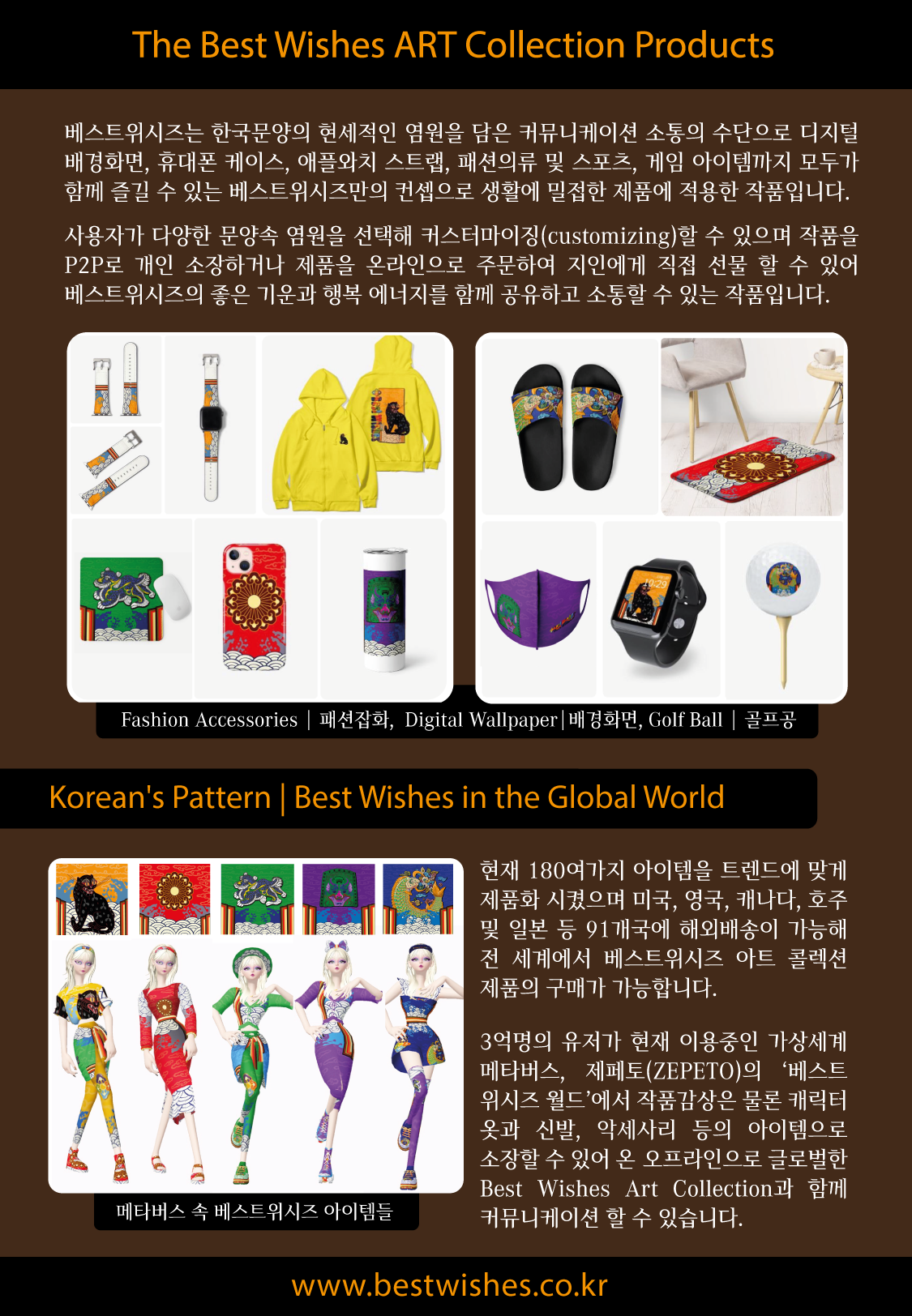 Best Wishes is a means of communication that embodies the temporal aspirations of Korean patterns. It is a concept unique to Best Wishes where everyone can enjoy digital wallpapers, cell phone cases, Apple Watch straps, fashion clothes, sports, and game items. It is a work applied to products closely related to life.
