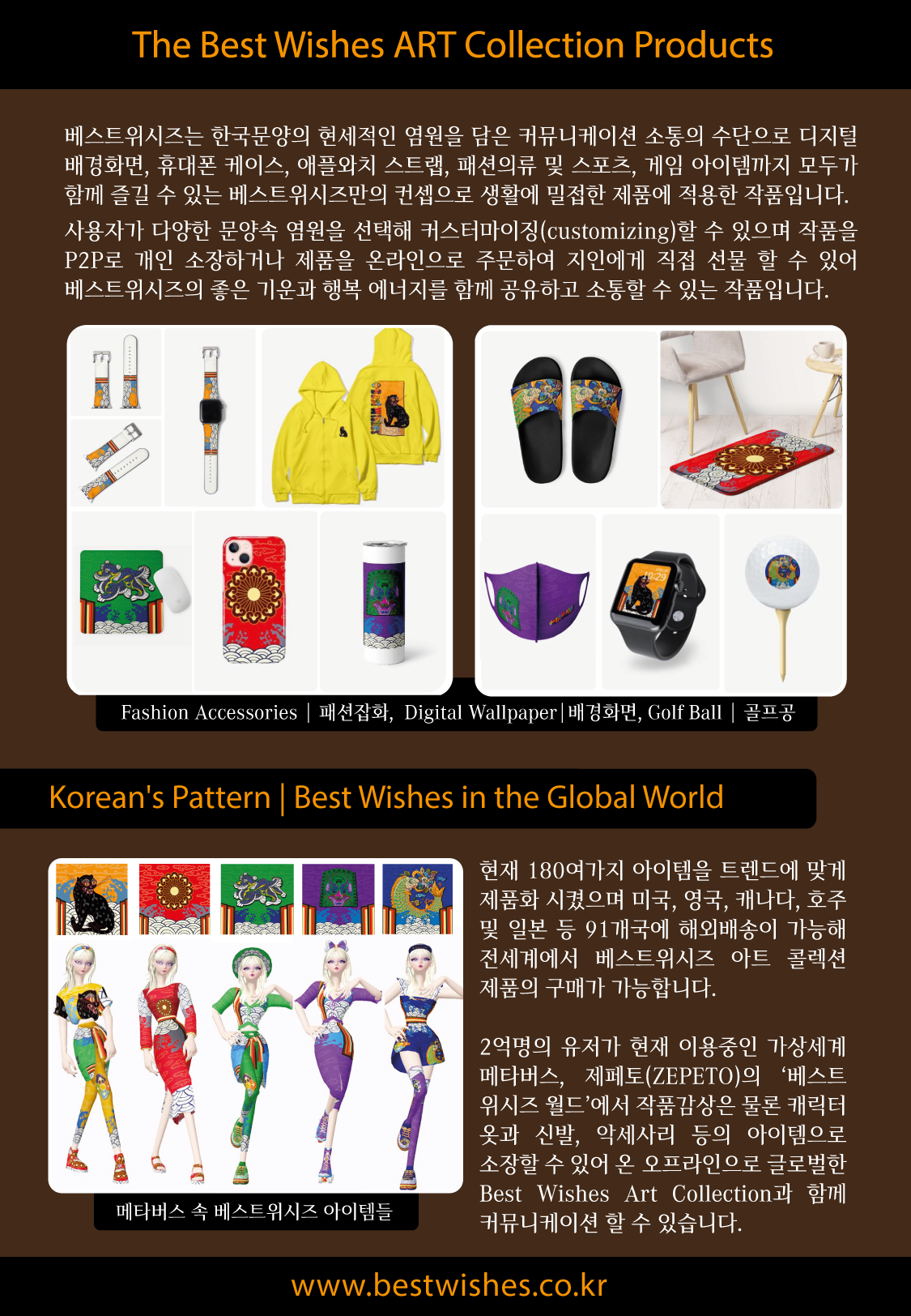 ベストウィッシュズは韓国文様の現世的な願いを込めたコミュニケーションコミュニケーションの手段で、デジタル壁紙、携帯ケース、アップルウォッチストラップ、ファッション衣類及びスポーツ、ゲームアイテムまで全てが一緒に楽しめるベストウィッシュズならではのコンセプトで生活に密接な製品に適用した作品です。人間は長年にわたって世の中に生まれ、福を受けて裕福で元気に暮らすことを願ってきたが、不老長生や富貴映画、入身養明など健康と富、出世、愛など変わらない念願を込めた伝統思想を韓国文様で見つけて作品化しました。