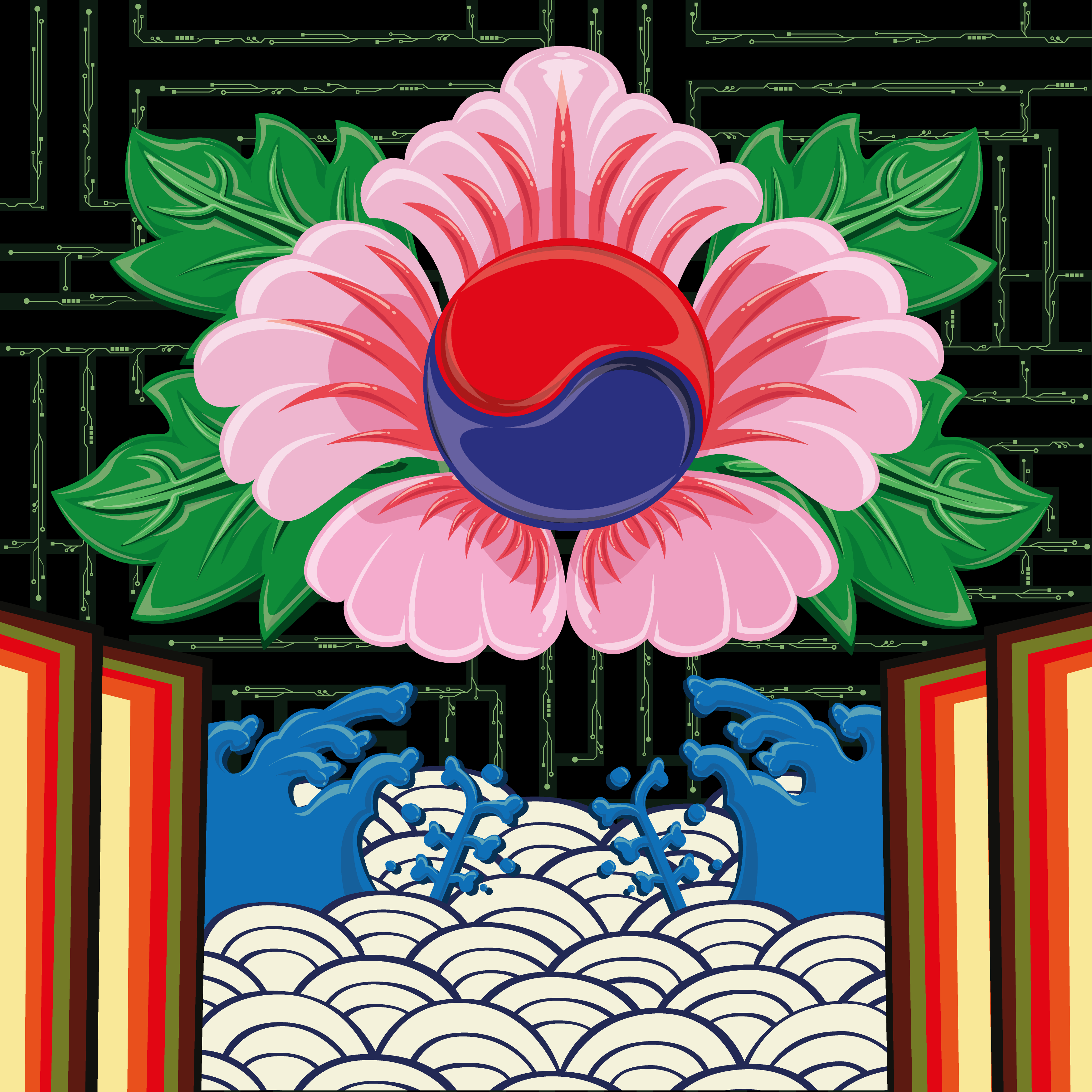 大韓民国の国旗 太極旗の太極文様は音と陽の宇宙万物の調和と発展の象徴であり、菊の「無窮花」は「空間や時間が無い」という意味を込めている 。 宇宙万物の調和と永遠の成長と発展を盛り込んだ大韓民国を象徴するために「太極化(Meta Taegeukhwa)」をデザインした。